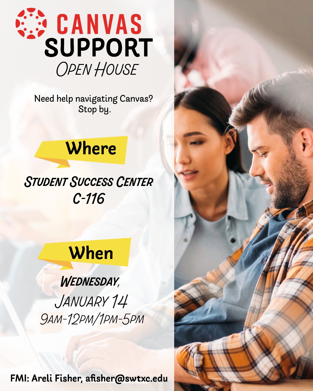 Jan. 14 | Canvas Support Open House | Building C, Student Success Center | 1:00 pm - 5:00 pm