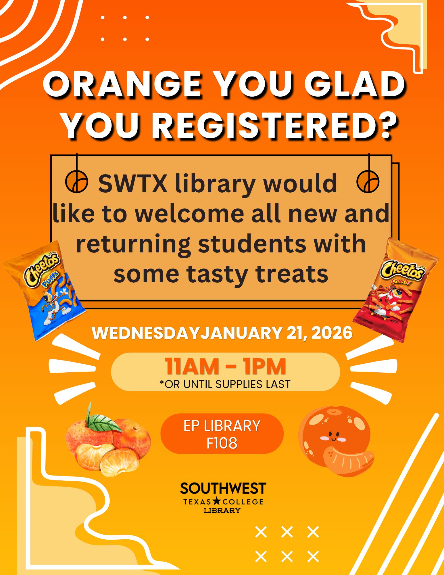 Jan. 21 | Orange You Glad You Registered? Welcome to Spring 2026 | Building F, Room F-108 | 11:00 am - 1:00 pm