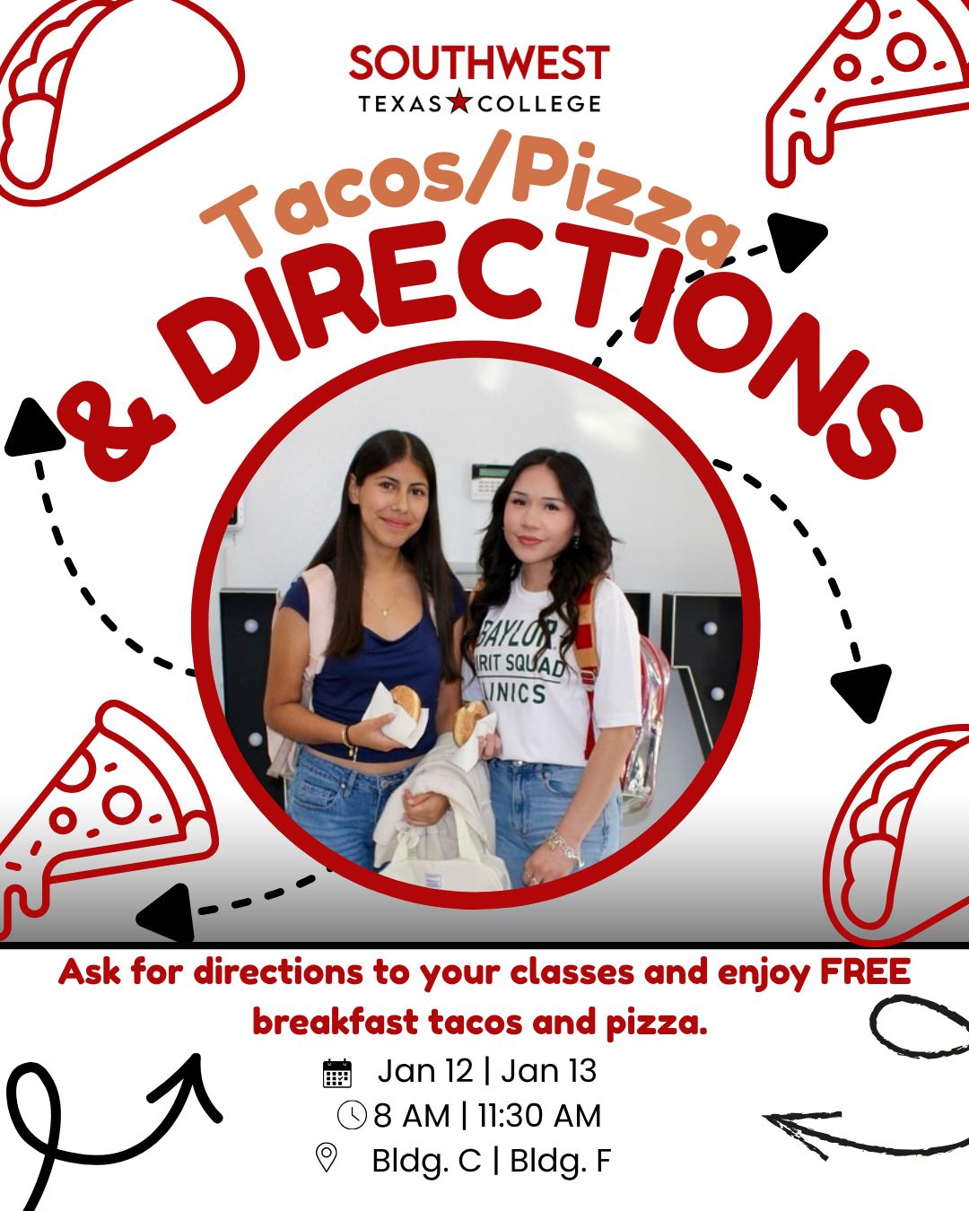 Jan. 12 | Tacos & Directions | Building C, Outside Student Lounge | 8:00 am