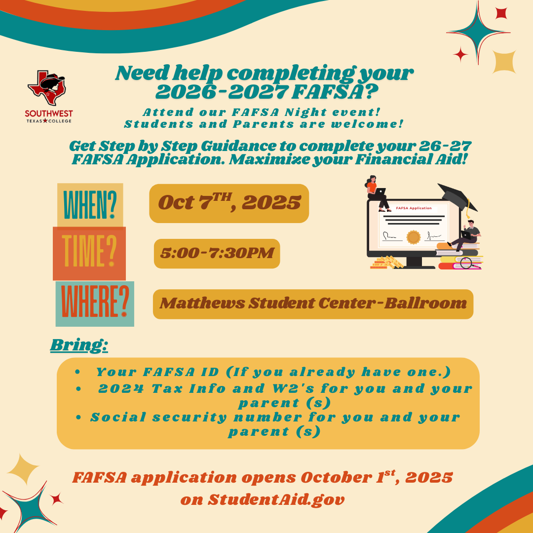 Oct. 7 | FAFSA Workshop | Matthews Student Center Ballroom | 5:00 pm - 7:30 pm