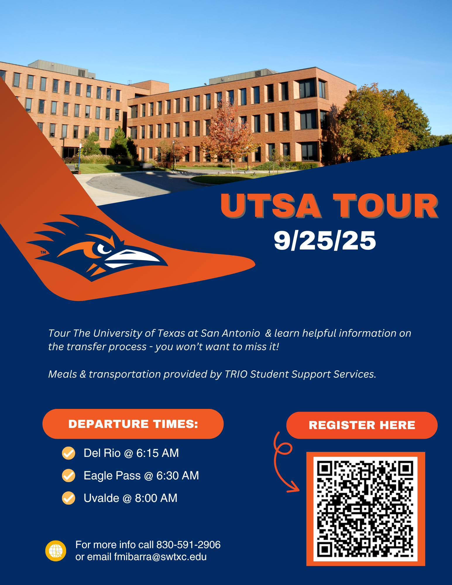 Sept. 25 | TRiO Student Support Services Campus Tour: The University of Texas at San Antonio | San Antonio, TX | Departure Time from Uvalde Campus: 8:00 am